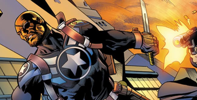 Otro dato interesante de este Nick Fury Jr. es que usa un antiguo traje de Captain America como uniforme.