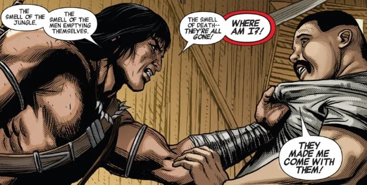 La trama se desarrolla en la reciente serie de cómics Savage Avengers, específicamente en el séptimo número. Allí, Conan entra a un bar en Brasil y es sorpresivamente abatido por un dardo que lo deja inconsciente.