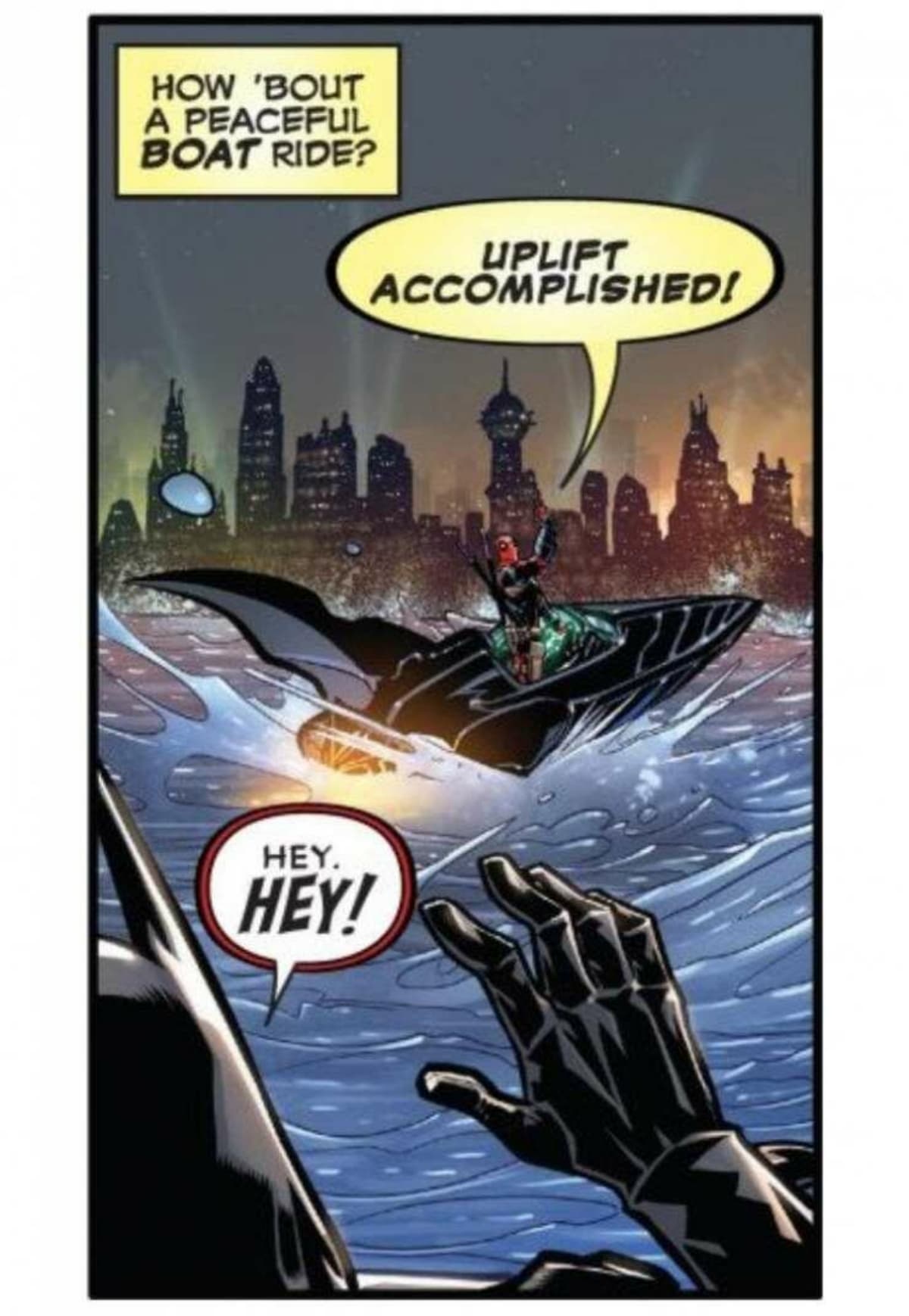 Se come todo el buffet vestido de galactus, se burla de Cable y escapa en un pacifico bote que encontró, que evidentemente lo robo de Batman, ya que puede verse su silueta mientras le reclama por llevarse su vehículo.