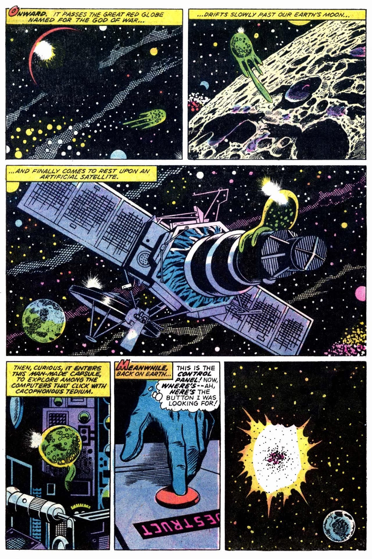Pero se ve que para Steve Skeates no fue suficiente. Para 1974 el guionista se encontraba trabajando en Marvel Comics en los números de The Savage Sub-mariner (sí, otro superhéroe de las aguas). En el #72, Namor debe afrontar la crisis por la caída de un satélite sobre la ciudad. ¿De quién era el dedo puesto sobre el botón de destrucción? Queda a la imaginación. Curiosamente la serie regular de Namor también terminó en ese número.