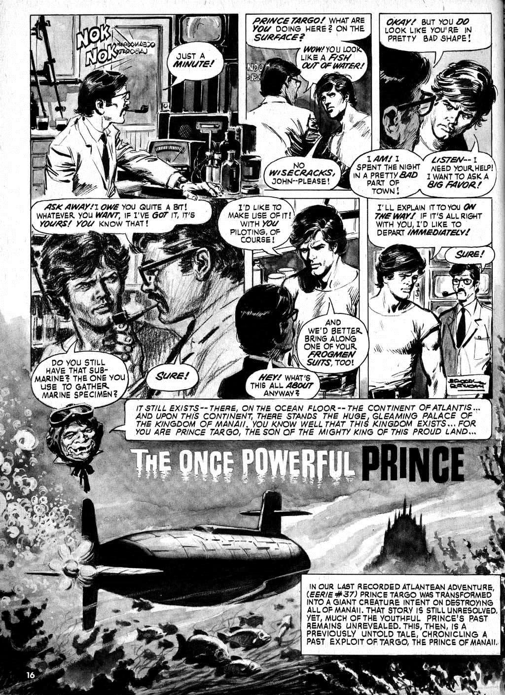 Steve Skeates tenía el guión para el número 57 de Aquaman, pero la serie regular terminó ahí (continuó recién en septiembre de 1977 y solo hasta el 63 cuando se volvió a cancelar). ¿Qué hizo entonces? Se fue a Warren Publishing y creó un personaje acuático llamado Targo, Príncipe de Manaii, cuya primera aparición fue en diciembre de 1971 en la revista número 36 de la serie EERIE, en la aventura Prototype. Evidentemente a Skeates no le gusta desperdiciar nada ya que para la EERIE #40 utilizó el guión de la que iba a ser Aquaman #57. En este capítulo le roban los poderes al Príncipe Targo.