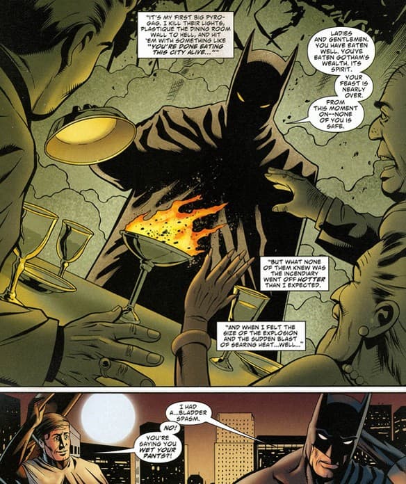 No suena muy heróico y la verdad es que no lo fue. Batman puede contra todos y es intimidante, como en Batman: Year One de Frank Miller (inspiración para Christopher Nolan en su trilogía fílmica). Una parte destaca y es cuando cae de manera terrorífica en una cena de burócratas y mafiosos. En pocas palabras, Batman les dice que sus rutinas de ricos y prepotentes criminales han llegado a su fin. Es una atmósfera increíble.