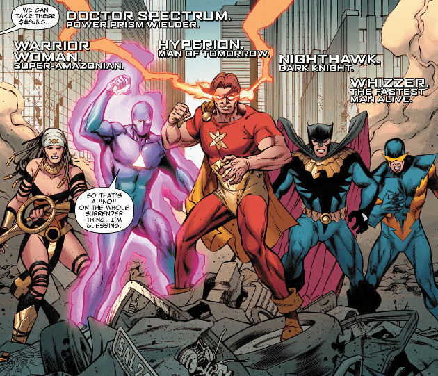 ¿Suena familiar? Acabamos de describir los poderes de Superman, Batman, Green Lantern y The Flash, quienes en esta historia era competencia directa de los Avengers, además de ser malvados. Posteriormente, ya en la década de los 70, Thomas decide volver a usar su equipo en el número 85 de la serie, pero esta vez una versión heróica de la tierra paralela denominada 712. Agrega además unos personajes nuevos: Power Princess (una princesa amazona), Amphibian (quien puede respirar bajo el agua), Golden Archer (quien usa arco y flecha) y muchos otros. Esta vez serán conocidos como Squadron Supreme y pelearán junto a Avengers (tras una pelea entre ellos por el símil de nombres con villanos derrotados anteriormente) contra una amenaza común.