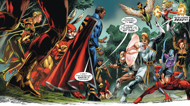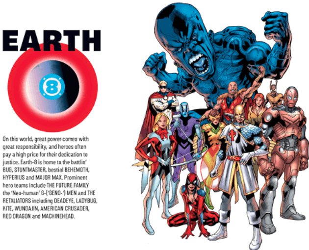 Posteriormente, y tras reunir a un ejército de superhéroes de todo el Multiverso, los protagonistas viajan por accidente a la Tierra 8, en donde se encontrarán con un grupo conocido como Retaliators, equipo defensor de esa realidad paralela. Cabe mencionar que Retaliators se puede traducir como "Vengadores" al español, al igual que " Avengers". Entre los miembros de este grupo podemos mencionar: American Crusader (Captain América), Machinehead (Iron Man), Bug y Ladybug (Spider-Man y Spider-Woman), Deadeye (Hawkeye), Behemoth (Hulk), los G-Men (X-Men), Future Family (Fantastic 4) y Wundajin (en referencia clara a Mjlonir, martillo legendario de Thor).