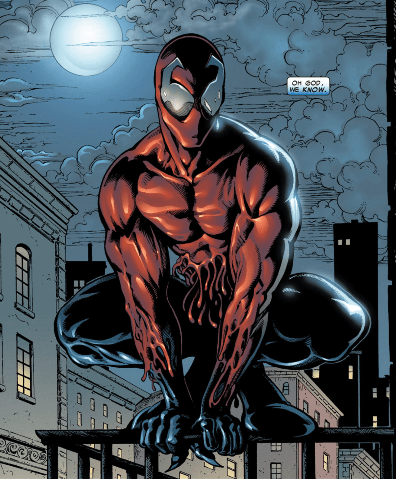 Cletus Kasady es un asesino serial que compartía celda con Eddie Brock; cuando Brock escapa convertido en Venom, unos restos del symbiote llegan hasta Kasady, el extraterrestre gesta otro symbiote usando el torrente sanguíneo de Kasady y lo transforma en el sanguinario Carnage. Con poderes similares a los de su “padre”, además de poder crear filos y cuchillas con su cuerpo.