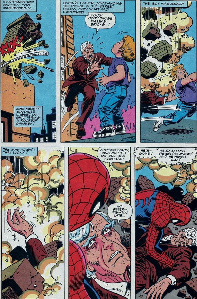 George Stacy, fue un diligente policía aclamado por sus compañeros. Es el padre de la enamorada de Peter Parker, Gwendolyn Stacy. Defendió siempre a Spider-Man y trató de que la opinión pública sobre el superhéroe mejorara. Fue uno de los primeros en darse cuenta de que Peter Parker es Spider-Man. No poseía habilidades ni poderes.