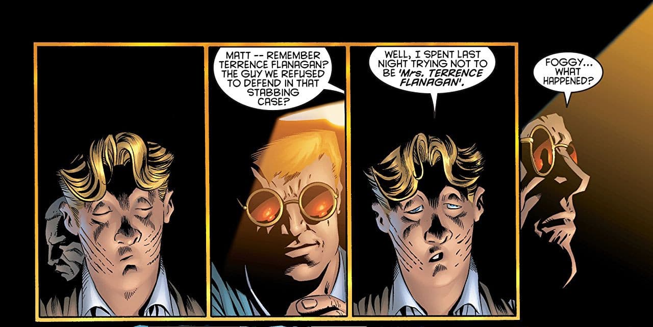 Matt Murdock adoptaría este tipo de gafas recién en 1998, con la aparición de su nueva colección, de la mano de los ilustradores Joe Quesada y Jimmy Palmiotti. En este caso en particular, las gafas de cristales rojos fueron una medida artística para identificar a Matt entre una multitud de personas que también usaban gafas oscuras, no solo porque es una forma de hacer que el personaje se vea elegante y «a la moda», sino porque, principalmente, el rojo es el color con el que inmediatamente se asocia a Daredevil.