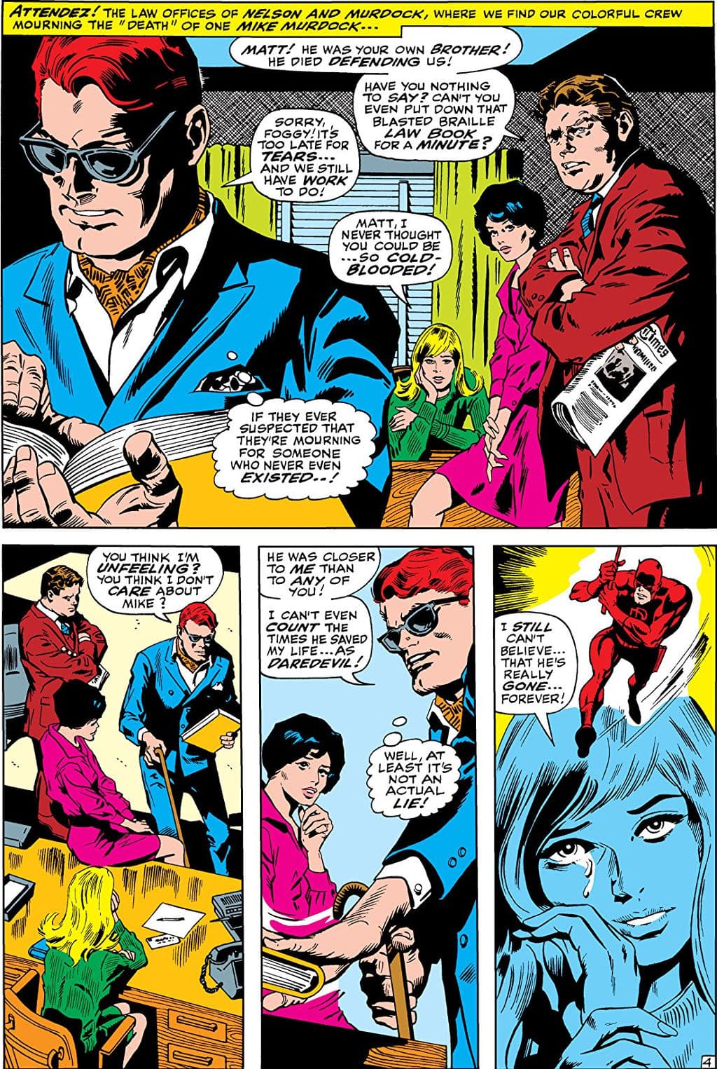 Por suerte Foggy y Karen no son demasiado inteligentes, ya que Matt comienza a aparecer «disfrazado» de su hermano gemelo (que casualmente también es ciego) y esto parece alejar todas las dudas en la mente de sus amigos. Esta clase de tramas extrañas suelen resolverse rápidamente en los cómics para devolver todo a la normalidad pero Stan Lee estiró toda la confusión del hermano gemelo por más de un año. No fue hasta Daredevil #41 (junio, 1968) que el legendario genio de Marvel decidió deshacerse de Mike Murdock; para ello hizo que Matt simulara la muerte de Daredevil durante una difícil batalla.