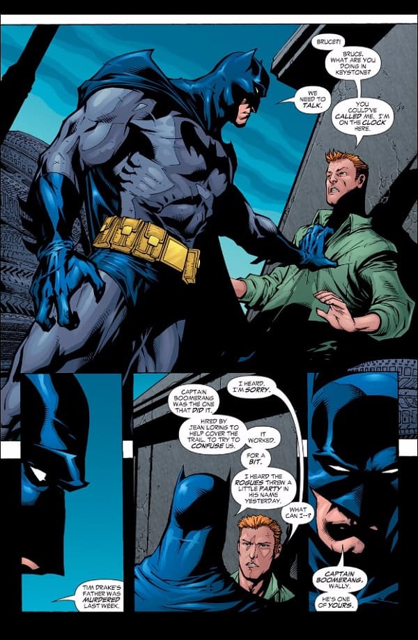 Se trata de un puesto engañoso ya que no es para una historia de Batman sino para una escena protagonizada por el caballero oscuro. Post-Crisis fue un issue único que se coló en las páginas de The Flash #217 (febrero, 2005) y muestra el duelo de la galería de villanos de Flash tras la muerte de Captain Boomerang. En medio de la situación, Batman se hace presente solo unos momentos (apenas un par de páginas) y confronta a Wally West respecto a la muerte de los padres de Tim Drake a manos de Boomerang. Es una escena pequeña pero perfectamente encapsula las diferencias entre la galería de villanos de Flash y Batman y se las arregla para mostrar cuán importantes son para el murciélago aquellas personas que elige tutelar.