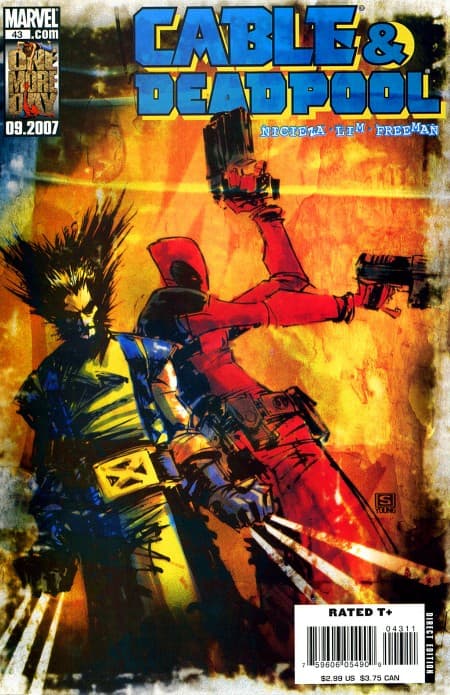 Hay ocasiones en que los artistas hacen ver a los superhéroes menos feroces de lo que son. En especial Deadpool junto a Wolverine. Te preguntarás dónde está Cable si el título lo anuncia pero solo aparece Wolverine en la portada junto a Wade Wilson. Tendrás que ver lo que tiene preparado el mutante de amarillo con azul...