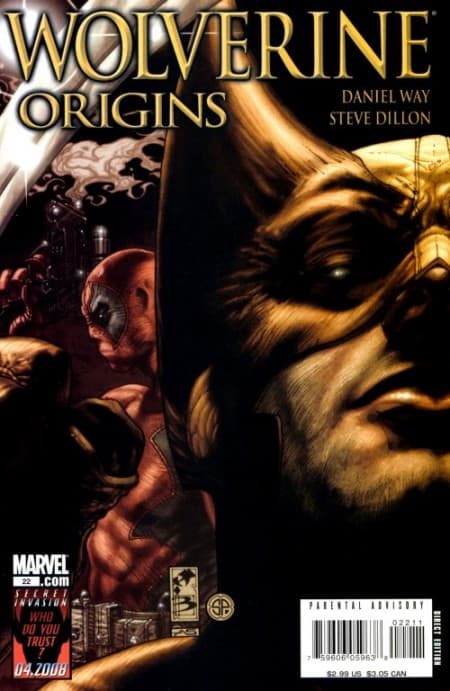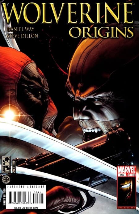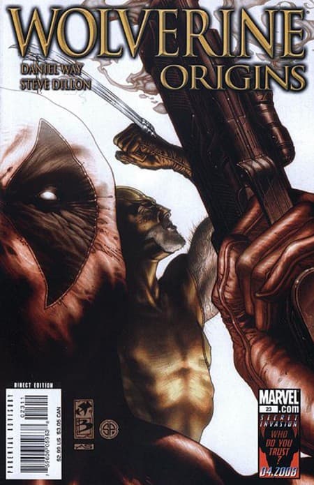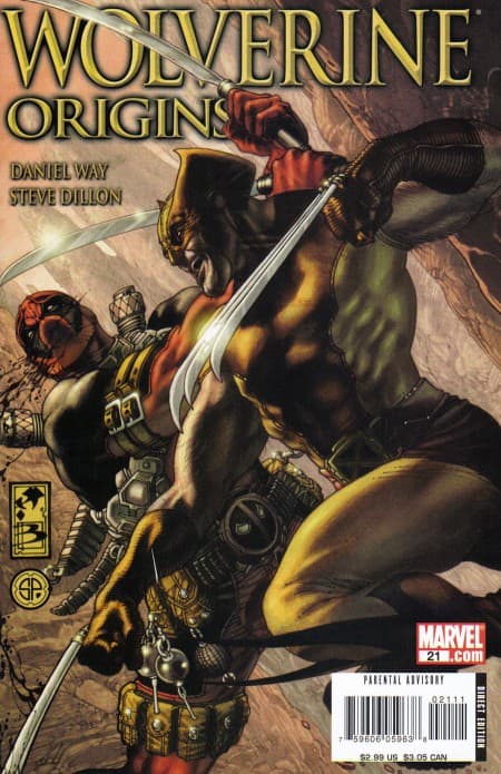 Una respuesta a la portada anterior. El brazo musculoso de Wolverine detrás del cañón humeante de Deadpool. Unas ilustraciones muy agradables. Si puedes, no dudes en coleccionar las creaciones de Wolverine Origins.