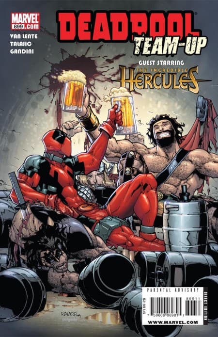 Una portada cómica y con mucho Deadpool. Hercules y el rojo mercenario disfrutan de unas cervezas en plena charla tranquila. Wolverine está tirado y maltratado. Tiene incluso una espada atravesando su cuerpo. ¿Te recuerda a la primera portada?