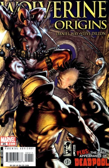 La misma portada dice que es la aparición más injustificada. Wolverine llega a un cómic de Deadpool con furia una vez más. Deadpool tan irreverente mencionándolo con gracia. Puedes notar que las garras de Wolverine no son de Adamantio. Mira los detalles.