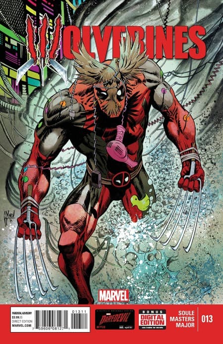 Con media máscara, furia y unas afiladas garras no habrá manera de parar a Wolverine. Una portada hasta con espectador: la cabeza del villano Administrator, grande en el fondo. Deadpool cambió las espadas por unos cuchillos de cacería, pero no parece haber sido una buena elección.