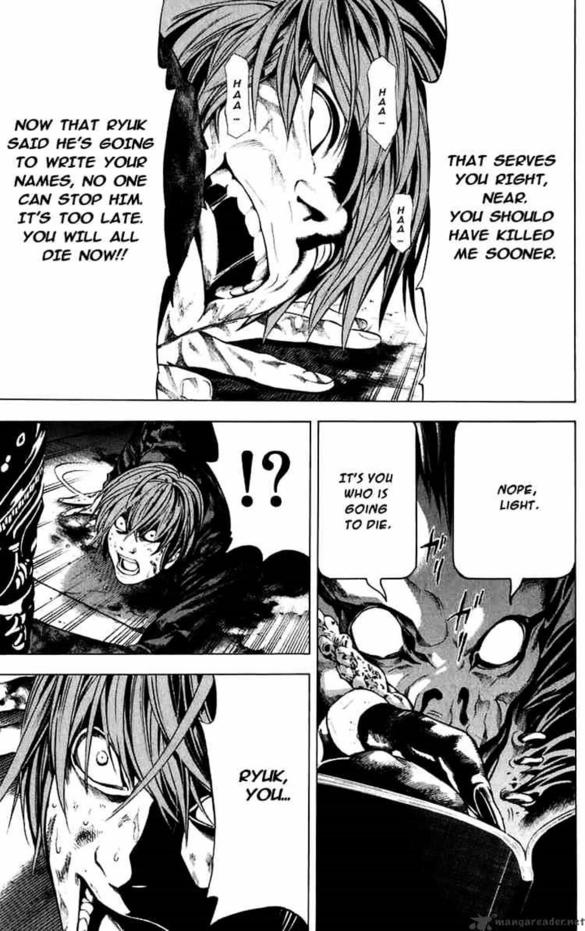 En la obra original, Light le ruega a Ryuk que mate a Near y a Matsuda, pero en cambio el shinigami escribe el nombre de Light, ya que no piensa esperar todo el tiempo en prisión hasta que el chico muera.
