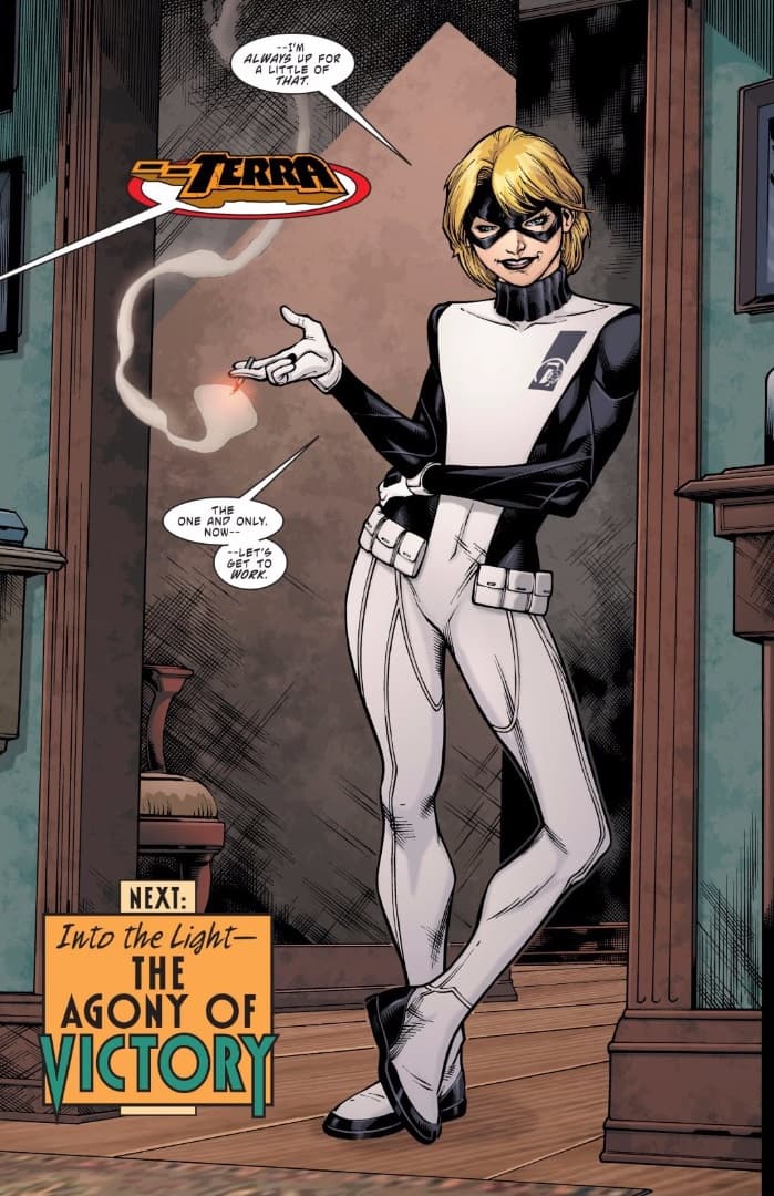 Deathstroke #21 guardó una sorpresa más para el final en la forma de la aparición de Terra. La chica que tiene una larga y complicada historia con Slade (que data del arco argumental ochentoso, The Judas Contract) se hace presente con su propio traje en blanco y negro. Esta es posiblemente la más dudosa de las adhesiones del equipo y tendremos que esperar hasta Deathstroke #22 para entender un poco más de la dinámica entre estos personajes.