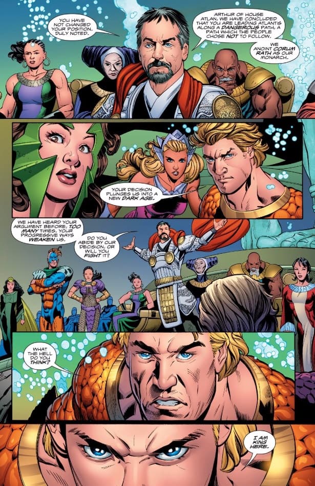 Finalmente, algunos de los grupos más conservadores de habitantes del reino de Atlantis se cansaron de las políticas progresistas del rey, y, con la ayuda del fundamentalista Corum Rath, cuestionaron la posición de Aquaman ante el concejo de ancianos. Ante la complicada situación, Mera le recuerda a Arthur que su lugar entre los humanos es casi tan importante como ser rey en Atlantis, ya que ambos mundos corren en sus venas.