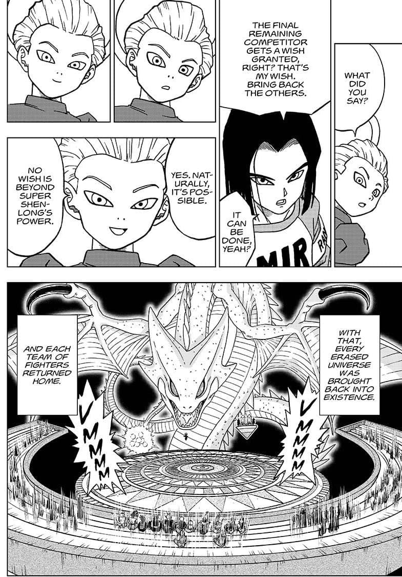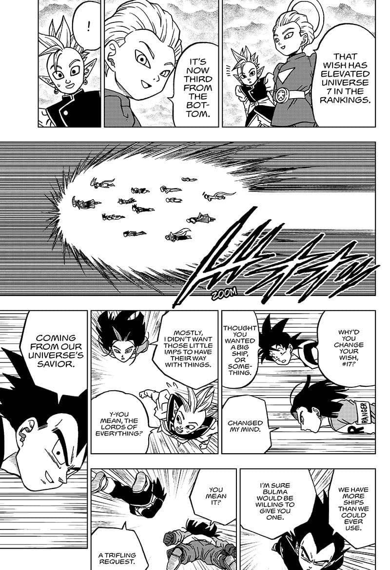 De esta manera, al igual que en el anime, pide que todos los universos sean restaurados y la petición eleva la posición del universo 7.