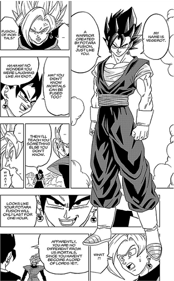 Siguiendo el mismo camino de la serie, Gokú y Vegeta se fusionan para enfrentar a Zamasu fusionado —después de que Trunks convenciera a Vegeta de dejar su orgullo de lado por amor a su madre, obviamente—. Mediante los aretes pothala nace un guerrero insuperable, el cual borraría a Zamasu por completo, sin dejarle tiempo para regenerarse. Ese guerrero se llama Vegerot... sí, como lo escuchaste.