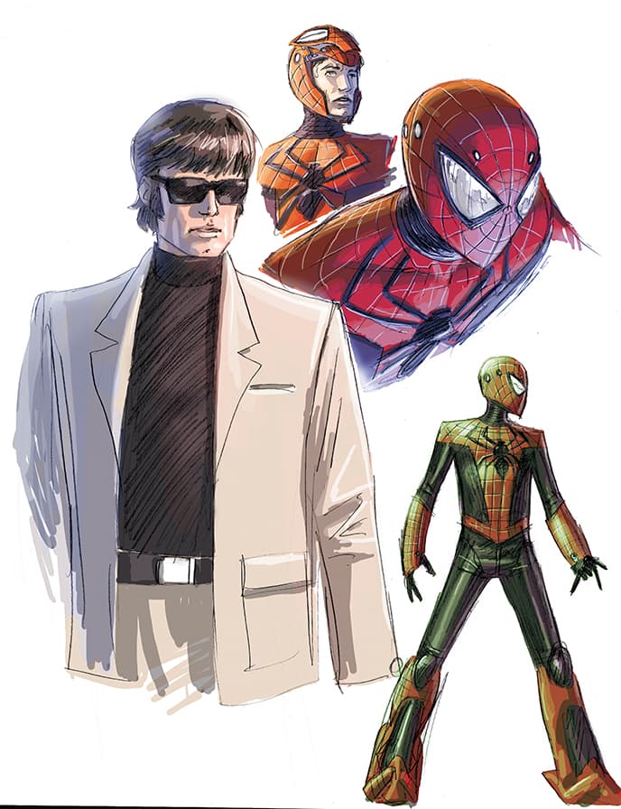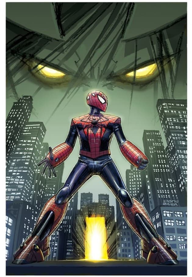 Desde la portada está claro que Weaver quiere presumir su versión de Spiderman como una más tecnológica, con notables influencias japonesas. Deja de lado cualquier consideración de perspectiva o dinamismo para darnos una imagen casi de ficha técnica donde resaltan detalles estéticos que recuerdan mucho a Mega-man.