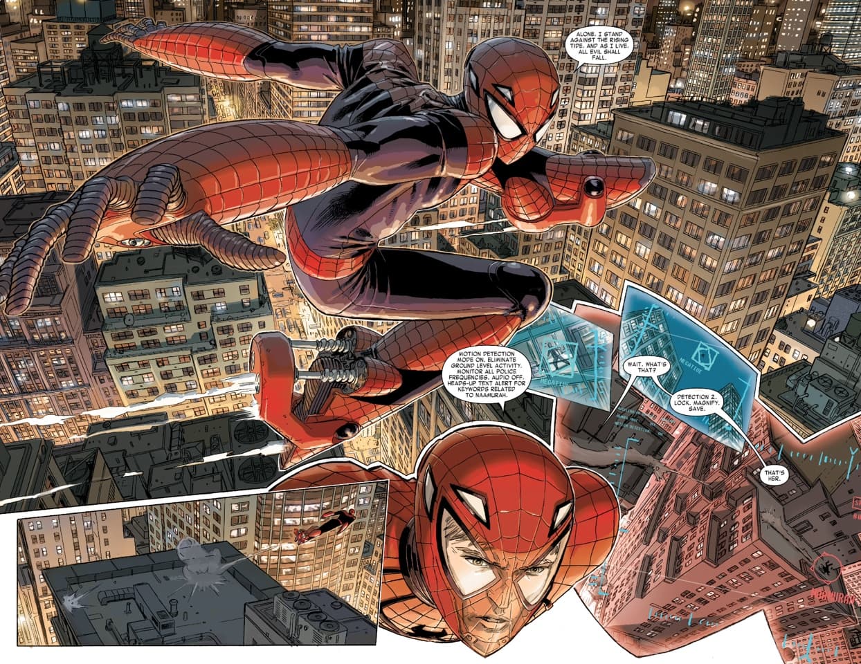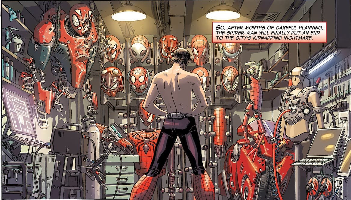 Y está claro que este es un Spidey de los más orientados a la tecnología. En las primeras páginas, durante una prolongada introducción al personaje, vemos algunos detalles técnicos de su casco, guantes y botas, y las habilidades que le dan cada uno. También, una de las viñetas más notables muestra a Aaron en su taller, frente a una multitud de piezas de equipamiento. Aquí resaltan una armadura y una motocicleta, de las cuales nos quedaremos con ganas de ver más, al menos por ahora.
