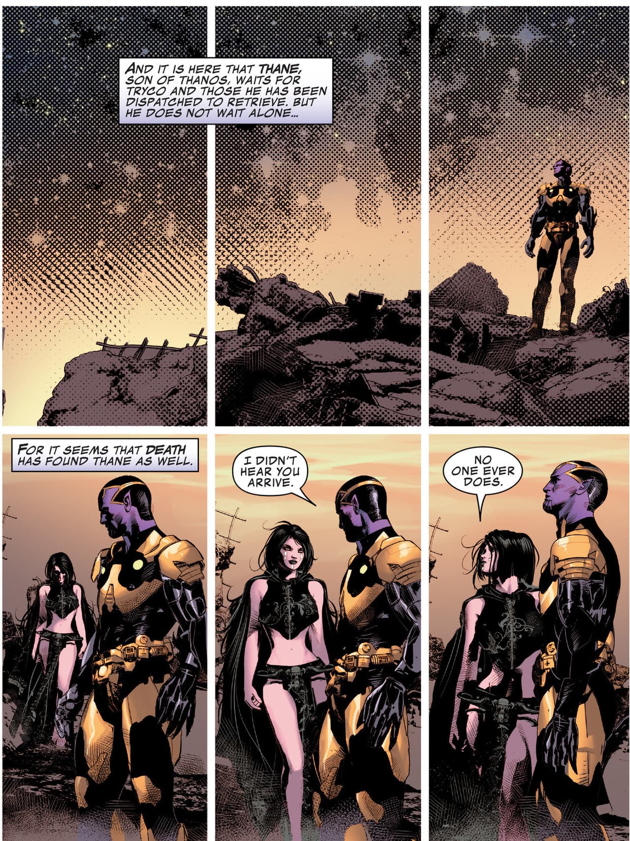 Ya con Thanos en su lugar habitual, contemplamos a Thane, el hijo del Titán loco, mientras planifica y reúne a un grupo de guerreros con el fin de derrocar a su padre. Entre estos personajes se encuentran: Tryco Slatterus, Starfox (a.k.a. Eros) y, aunque no lo creas, Death, quien supuestamente está detrás de todo este complot. Pero si pensabas que esto era todo, estás equivocado, la gran revelación viene a continuación...