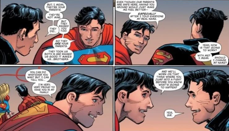 Ahora en el último tomo de Action Comics, Superman acepta a Conner como su hermano al ofrecerle una casa en la granja de los Kent pues se sentiría más seguro si su otro hijo los cuidara. Él rechaza la proposición, pero deja en claro que aunque no están realmente emparentados ambos concuerdan que sí son hermanos por ser criados por las mismas personas y están orgullosos de llamarse familia.