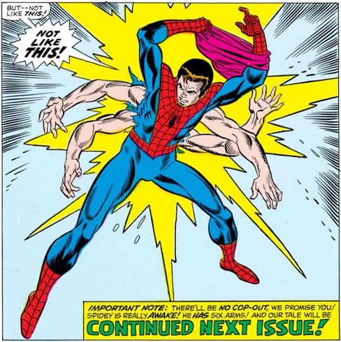 El resultado está en el título. Parker se despertó con 2 pares extras de brazos que salían directamente de su torso. Una perturbadora imagen. Por suerte, Spidey encontró una pronta cura para esta aflicción con la ayuda del vampiro Morbius.