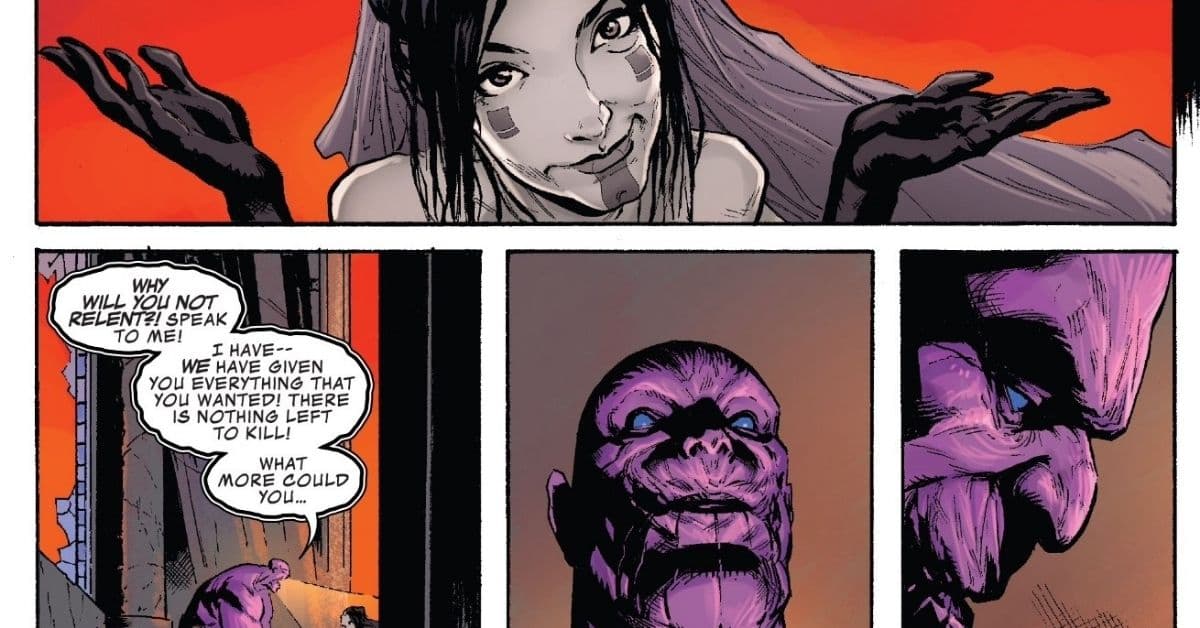 La confusión de Thanos es evidente, porque el nunca tuvo intimidad con Death; sin embargo se explica que como el ya había muerto con anterioridad, esa energía se unió con la de ella y de allí se creo este horror descrito por la Bruja Escarlata como una magia oscura y terrible.