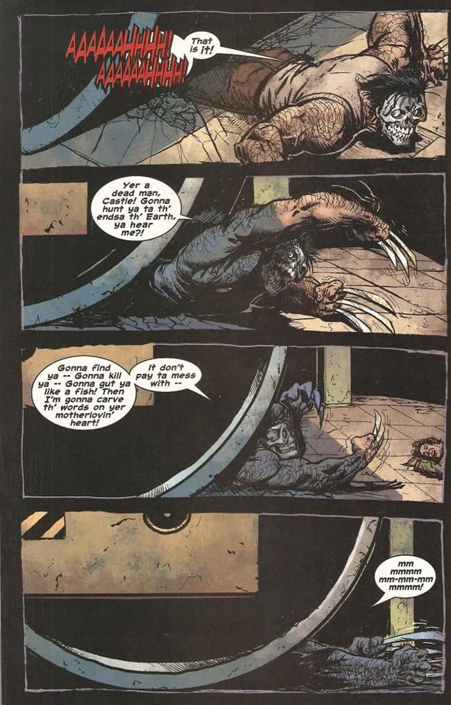 En el número 17 de Punisher, publicado en el 2002, Frank Castle pone a Wolverine en uno de los peores momentos de su carrera: luego de volarle la cabeza con una escopeta, repite el procedimiento con sus genitales, y procede a aplastarlo con una aplanadora industrial, en un momento que parece casi sacado de un sketch del Coyote y el Correcaminos. Ilustrado por Darick Robinson, y escrito por Garth Ennis, es uno de los puntos más extremos a los que haya llegado el personaje en su historia.