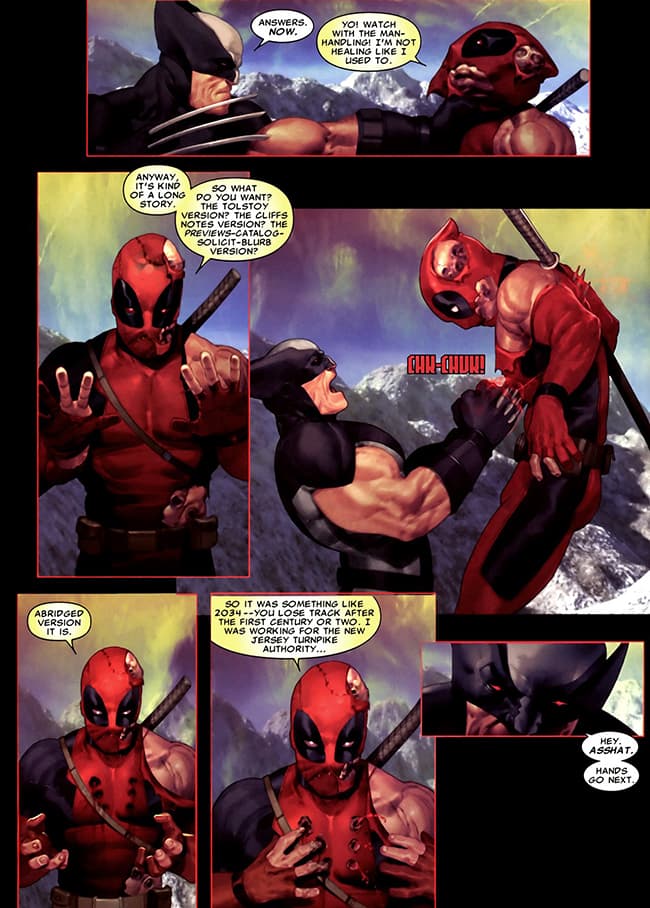 El Merc With a Mouth se ha cruzado con Wolverine en numerosas ocasiones, y el cruce de sus habilidades de regeneración garantiza que siempre son batallas épicas. En el número 44 de Cable & Deadpool somos testigos de una batalla corta, pero que le da la oportunidad a ambos de alardear de sus poderes, haciéndose daño a niveles realmente épicos.