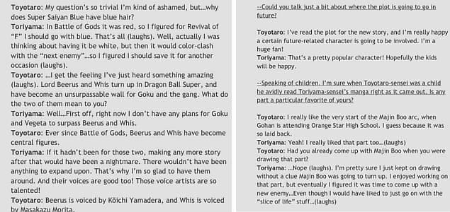 Toyotaro: Mi pregunta es tan trivial que estoy como avergonzado de preguntar pero, ¿por qué los Super Saiyan tienen el cabello azul? Toriyama: En Battle of Gods el cabello fue rojo, por lo que decidí hacerlo azul para Revival of F. Eso es todo. En realidad pensaba hacerlo blanco, pero hubiera chocado con el color de cabello del próximo enemigo. Así que decidí reservarlo para otra ocasión.