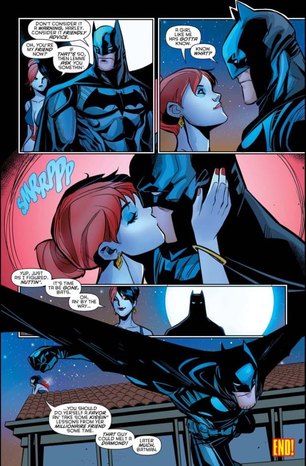 Es la primera vez que Harley se pone el uniforme de Robin. No obstante, en diversos cómics especiales de DC, en la película Suicide Squad (2016) y hasta en la serie animada de los 90 la villana ha demostrado un poco de simpatía por Batman, al menos la suficiente como para besarlo.