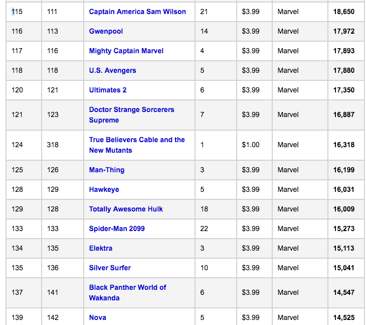 De esta tabla podemos rescatar varias conclusiones. Primero, que personajes importantes como Carol Danvers y Sam Wilson son un fracaso de ventas. Esto es preocupante por dos razones: Carol pronto tendrá su versión del MCU y el personaje se ha visto envuelto en polémicas por los constantes relanzamientos, que han llevado a creativos como Kelly Sue DeConnick a dejar Marvel. Segundo, varios de los personajes a los que llamamos redundantes ( Amadeus Cho, Sam Wilson, Gwenpool o equipos con la palabra Avengers en el título) se encuentran en esta parte de la tabla de ventas.