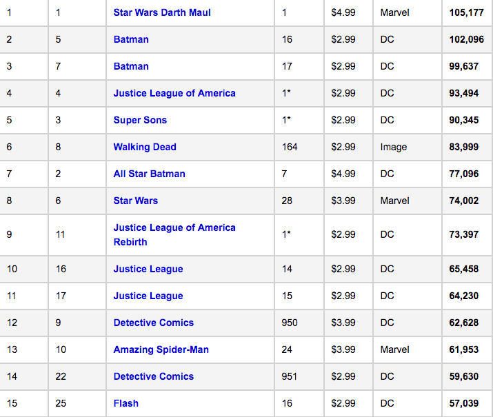 Como puedes apreciar, sin contar a Star Wars (que en ninguna forma le debe su popularidad al trabajo de los editores de Marvel), entre los 15 más vendidos solo se encuentra Amazing Spider-Man. En un mes en el que no hay #1, las ventas de Marvel se derrumban de manera estrepitosa, para darle la victoria rotunda a DC Comics.