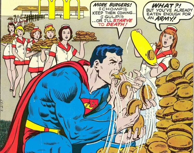 Así es, en Action Comics #454 pudimos ver a Sueperman comer aproximadamente una hamburguesa por segundo. La razón es que el hombre de acero siente una constante pérdida de energía. La causa es una extraña aleación de metales oculta en las profundidades de la tierra, que consume toda la energía solar que recibe el planeta. Nada como la comida rápida para recuperar energía... Llamen a un guionista.