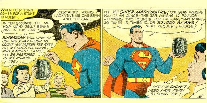 Supes no necesitaba de la visión de rayos X para saber cuántos dulces pueden caber en un frasco. Simplemente sabe lo que pesa una gragea, conoce el volumen del frasco y... el resto es supermatemática. Si él lo dice, debe ser cierto.