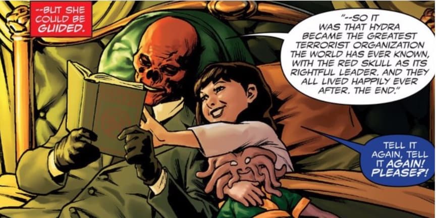 El villano cambió de idea antes de tirarla por un acantilado (qué considerado) y decidió instruirla desde pequeña en su filosofía de odio y destrucción. Sinthea creció para convertirse en la villana Sin pero, al ser mujer, Red Skull jamás la ha considerado seriamente para que sea su heredera.