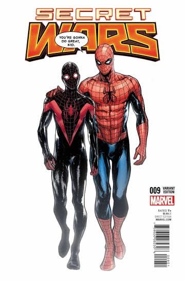 Hace poco vimos al nuevo arácnido, Miles Morales, tomar un giro en la historia de su personaje al verse navegando del Universo Ultimate (recientemente destrozado) al Universo Principal Marvel (el de las grandes ligas). Para agregar a todo, la madre de Miles Morales, quien muere en Ultimate Spider-Man #22 de 2013, parece seguir con vida. Es Secret Wars #9 la manera de descubrir qué pasa, por lo cual no te puedes perder tan buen cierre a este evento.