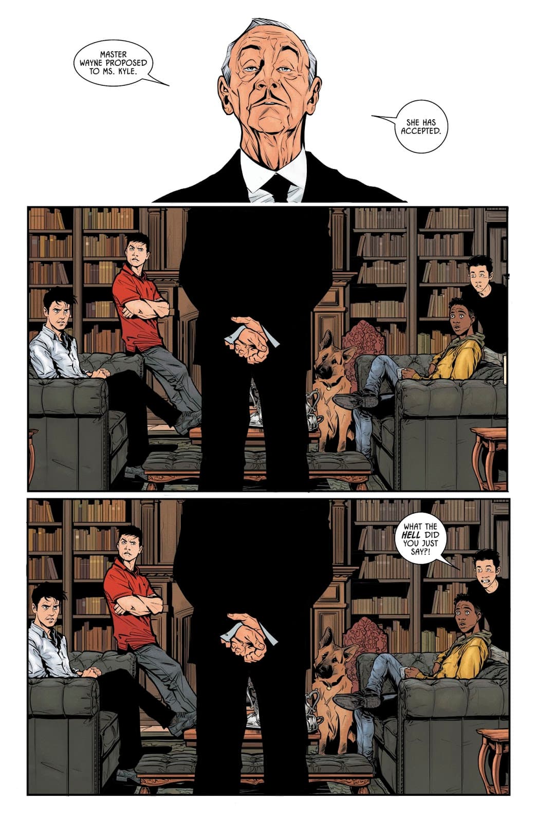 Inmediatamente, Dick se acerca para consolar a su hermano, quien confiesa la verdadera razón detrás de sus lágrimas: Bruce se dirigía a Khadym para reencontrarse con Talia Al Ghul, su madre.