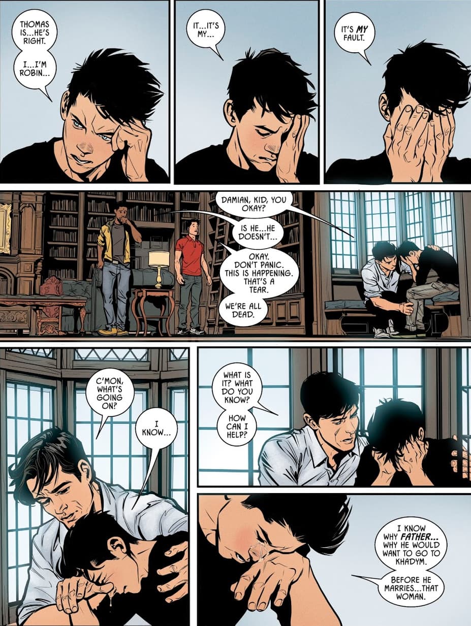 Por supuesto, ninguno de los Robin se esperaba tal revelación, en especial Damian, quien reaccionó trágicamente...¡y comienza a llorar! Tim creía en la escena. ¿Damian llorando? ¿Qué está pasando? Es cierto que se convertirá en el hijo de dos letales supervillanas, pero ¿para tanto?