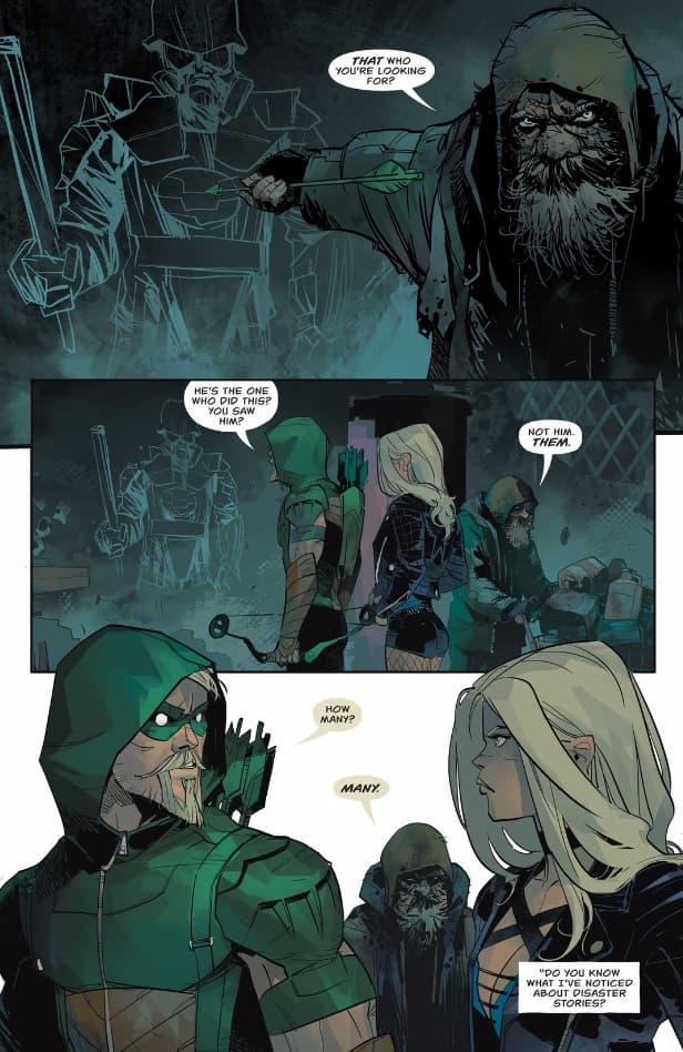 Sin embargo, los inconvenientes están a la vuelta de la esquina. Broderick sabe perfectamente que Oliver Queen es Green Arrow y aunque la ciudad cree muerto al ex millonario, su CFO está preparando una venganza apuntada al héroe. Green Arrow en compañía de Black Canary investigan la escena de un reportado incidente violento en una reconocida “casa de drogas” y llegan para encontrar que no hay víctimas en absoluto. La única pista que logran extraer viene de la mano de un vagabundo que se encuentra en el lugar y les revela a los héroes que el ataque estuvo a cargo de un grupo de hombres armados. ¿Cuántos? Muchos. Y todos tienen un aspecto ligeramente similar a Green Arrow.