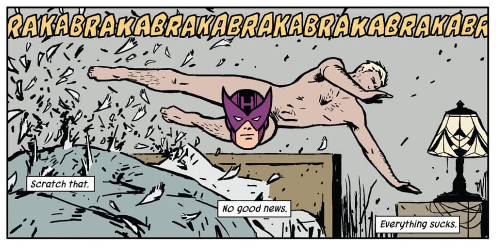 Otra muestra de la habilidad de la pluma de Fraction y la destreza de Aja para interpretar sus guiones y transmitirlos de forma magistral. Hawkeye no es una historia lineal, sino que va y viene, colmada de miradas al pasado y pasajes por situaciones que, aunque ya resueltas, no tenemos idea de cómo se resolvieron.