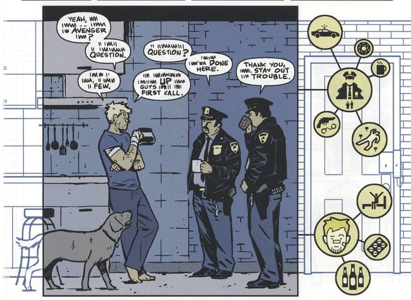 Para más condimentos en esta complejidad narrativa, en más de una oportunidad veremos la historia desde el punto de vista de otros de los implicados. Así como ya mencionamos que Kate Bishop protagoniza sus propios números y argumentos a los lados de la trama principal, también veremos qué ocurre desde los sucesivos villanos de turno, y disfrutaremos de todo un número a través de los ojos (y el hocico) de Lucky, alias Pizza Dog, el personaje más entrañable de toda esta historia.