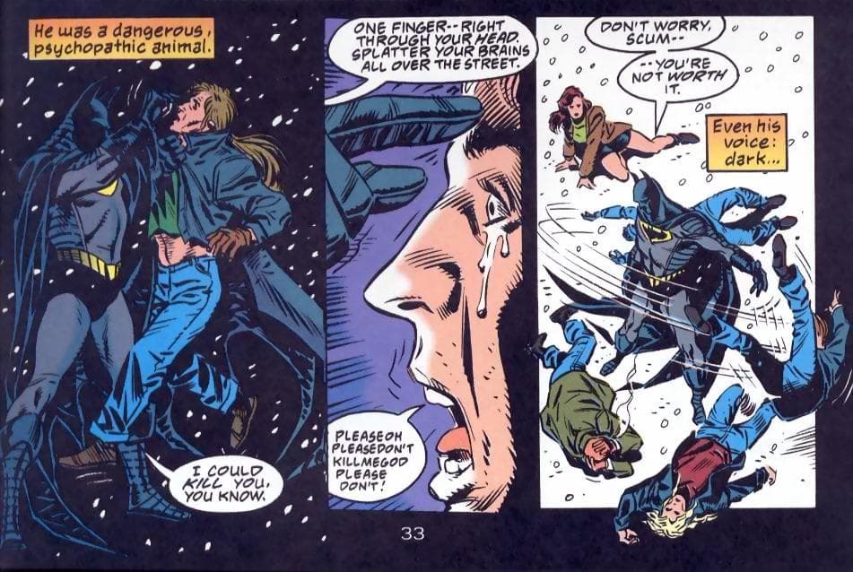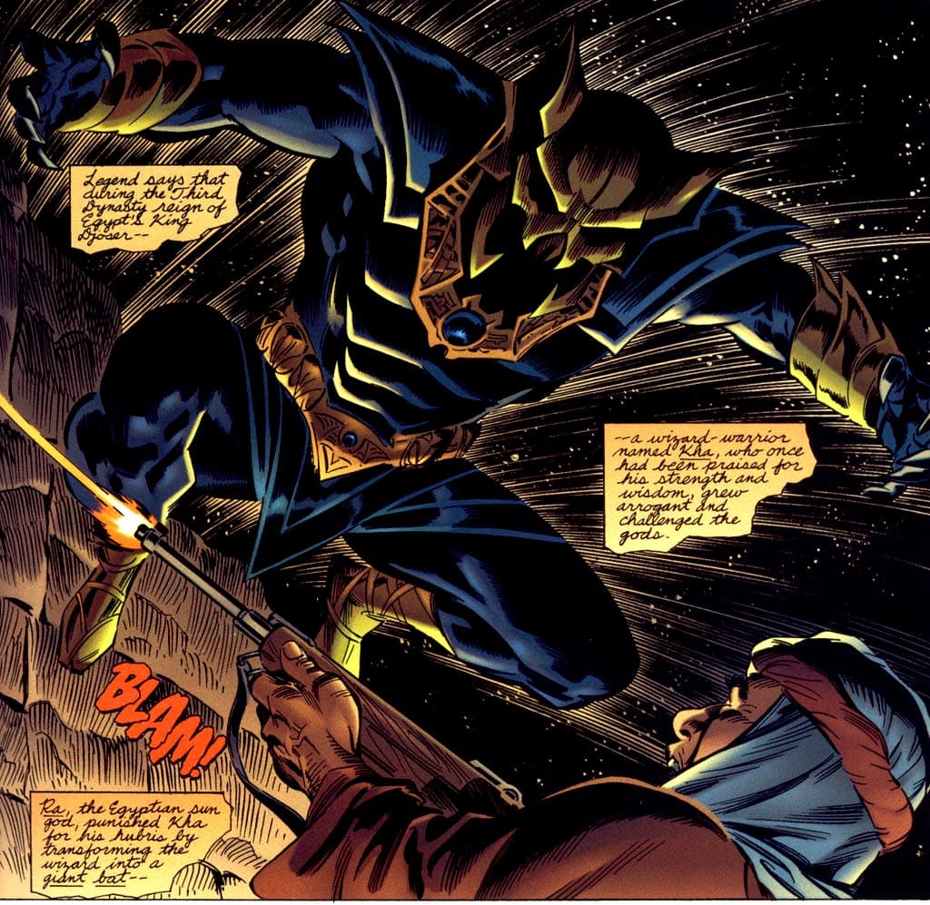 Una de las más extrañas versiones alternativas de Batman. Este personaje solo se convierte en el hombre murciélago después de encontrar la tumba de un antiguo hechicero egipcio llamado Kha. Bruce pasaba sus días como un soldado mercenario y llegó herido de muerte hasta el sarcófago. Su nuevo amigo hechicero le curó las heridas y le otorgó una armadura con temática de murciélago que Bruce utilizó para impartir brutal justicia a su estilo. Sin embargo, esta versión del personaje definitivamente no es un héroe, e incluso asesina a la contraparte de Superman en este universo.