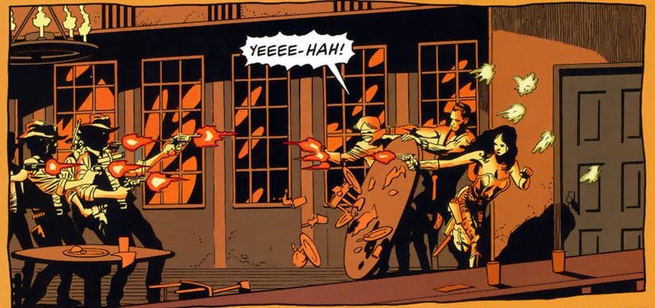 ¿Habrá dos temáticas más diferentes que la mitología griega y el Lejano Oeste? Posiblemente no, pero cuando Justice Riders presentó a Diana Prince como una sheriff sureña el book fue un inmediato éxito. Después de que su pueblo (llamado Paradise) es destruido, Wonder Woman se convierte en la líder de un grupo de forajidos en busca de venganza. Anda con una pistola en una mano y, en la otra, un lazo que usa para estrangular a sus enemigos hasta que le digan la verdad. Nada de magia en el Lejano Oeste.