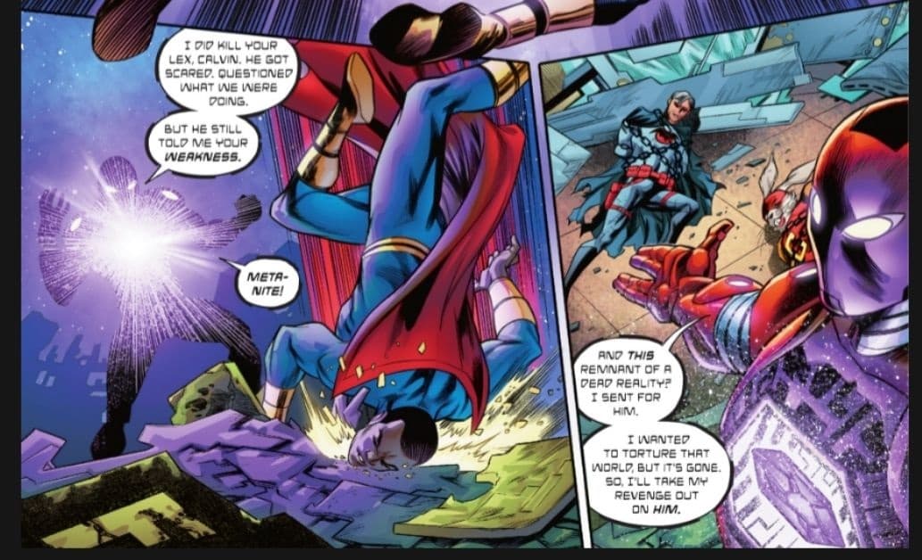 Al pelear contra la versión de Superman de la Tierra 23, Manchinehead revela que ha derrotado a Lex Luthor y sabe cuál es la debilidad de Superman, que en este universo se llama Calvin Ellis y es el presidente de Estados Unidos.