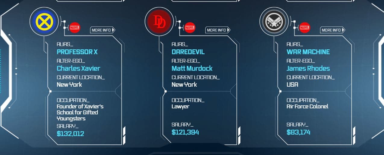 Daredevil y War Machine le siguen con 121 y 83 mil dólares anuales por conceptos de abogacía y coronel de la fuerza aérea.