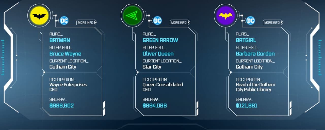 Como se mencionó antes, Batman y Green Arrow son los dos más ricos de todo DC Comics, al ser CEOs de su compañía; a ellos le sigue en ganancias mensuales Barbara Gordon, alias Batgirl, quien es la directora de la biblioteca pública de Gotham, con un salario anual de 121 mil dólares.