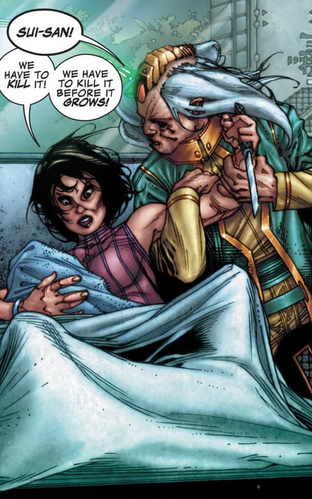 Lo increíblemente triste es que, años atrás, en el momento de su nacimiento, Sui-San notó que algo estaba mal con el niño y sugirió a su mentor, padre de la criatura, quitarle la vida ya que «había muerte en sus ojos». Con el cuchillo en mano, decidió matar a su propio hijo, sin embargo, fue detenida por su mentor, y juntos recapacitaron.